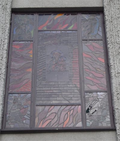Na bocznej zewnętrznej ścianie kościoła kompozycja, którą stanowi witraż Matki Boskiej Powstańczej, pod nim tablica poświęcona oddziałom powstańczym walczącym na Czerniakowie, pod tablicą pamiątkowy pocisk wbudowany w mur.