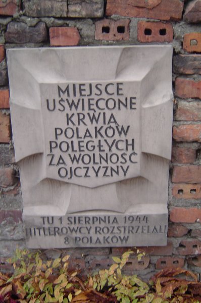 Sowińskiego 28. Tablica: "Tu 1.8.1944 hitlerowcy rozstrzelali 8 Polaków".