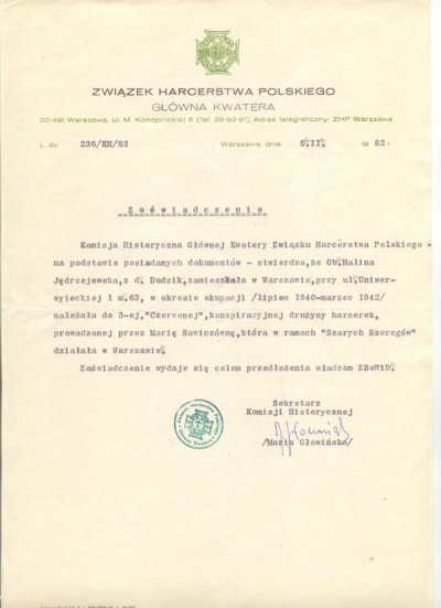 dokument potwierdzający przynależność Haliny Jędrzejewskiej-Dudzik do konspiracyjnego harcerstwa